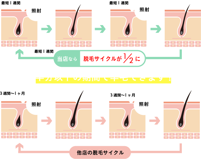 3週間〜1ヶ月で照射をしている店舗が多い中、当店では最短1週間で照射可能できる為、サイクルが早く最短での卒毛が叶います。