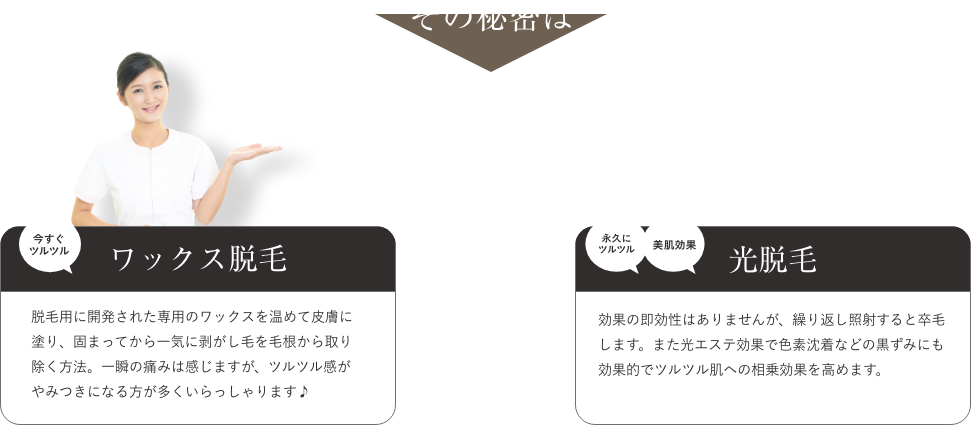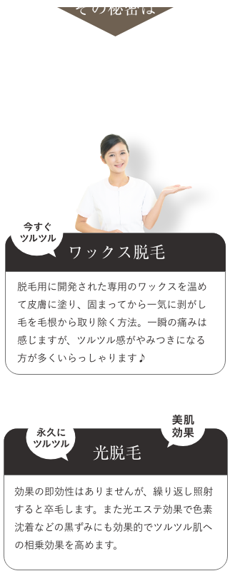 ワックス+光脱毛なら一度目の施術後すぐにツルツルを実感いただけます。事前処理の必要もなく、ご来店初日よりずっとツルツルのまま卒毛へ進みます。 施術後の爽快感をぜひご期待ください♪