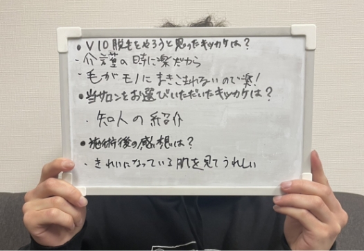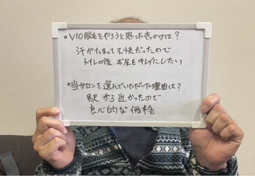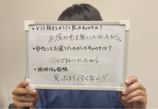 D.Tさん 30代お尻の毛をなくすため通ってます!思っているより痛くないし、都度払いが有難いです。
